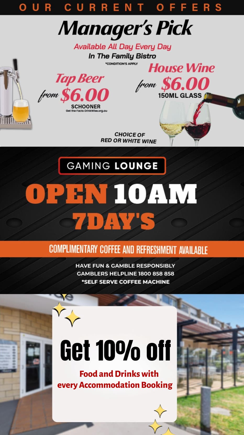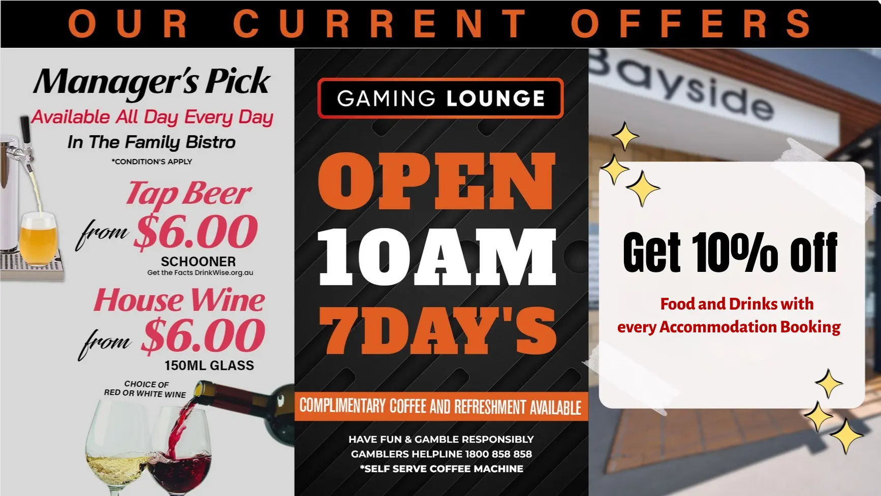 the Bayside Hotel provides a relaxed atmosphere with a great range of facilities with comfortable and affordable accommodation.