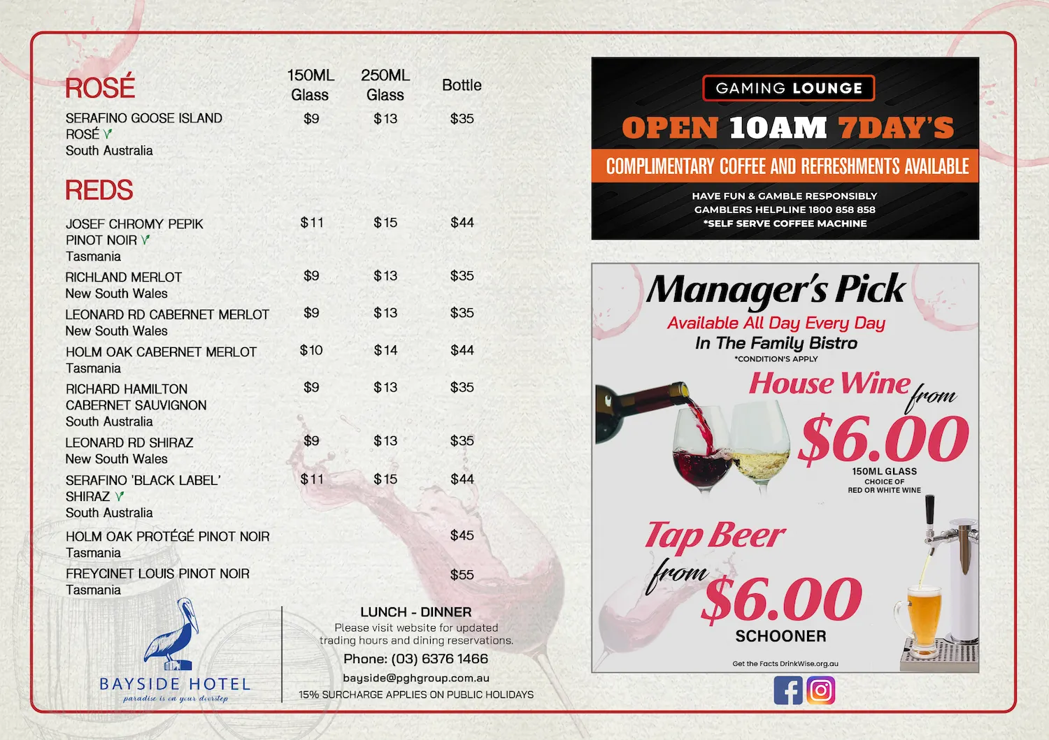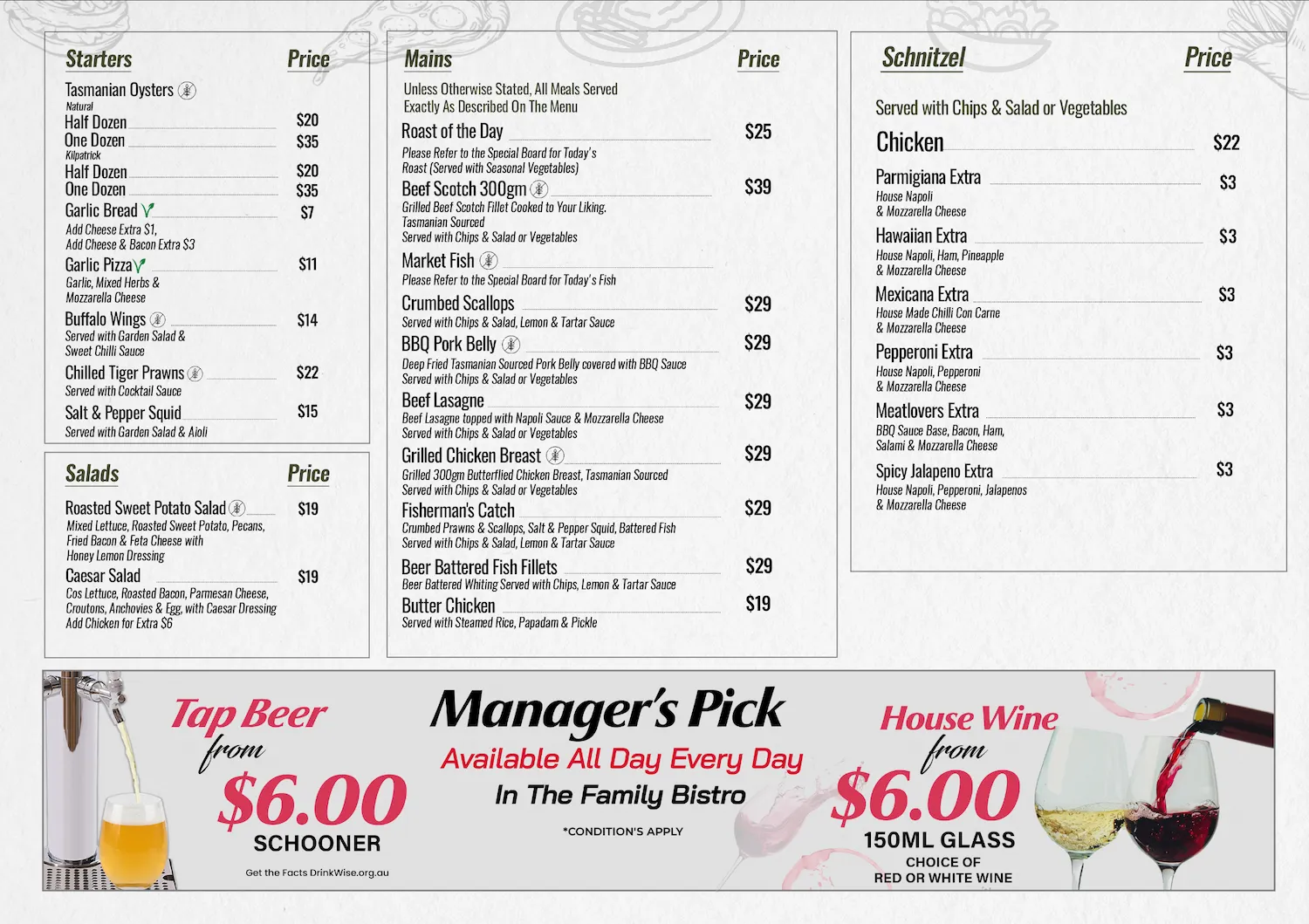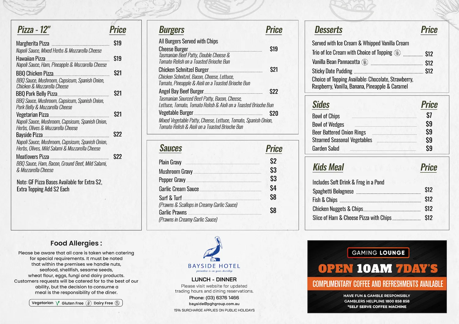 Call the Bayside Hotel on (03) 6376 1466 to place your takeaway.