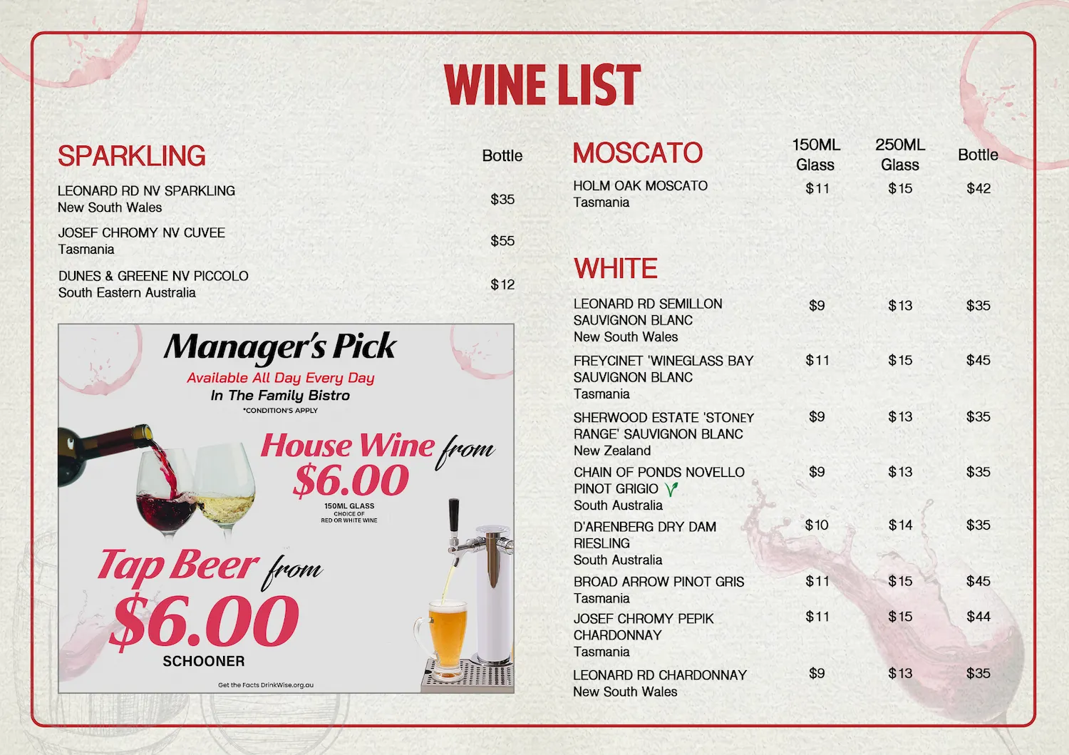 Take in sweeping views of Georges Bay while you dine. Settle in for lunch and dinner, indoors or alfresco, and savour fresh Tasmanian produce — from succulent steaks to local seafood — in a relaxed, family-friendly setting. Order drinks direct from the Bistro (beer, wine, spirits and non-alcoholic) and enjoy easy coastal dining, every day.