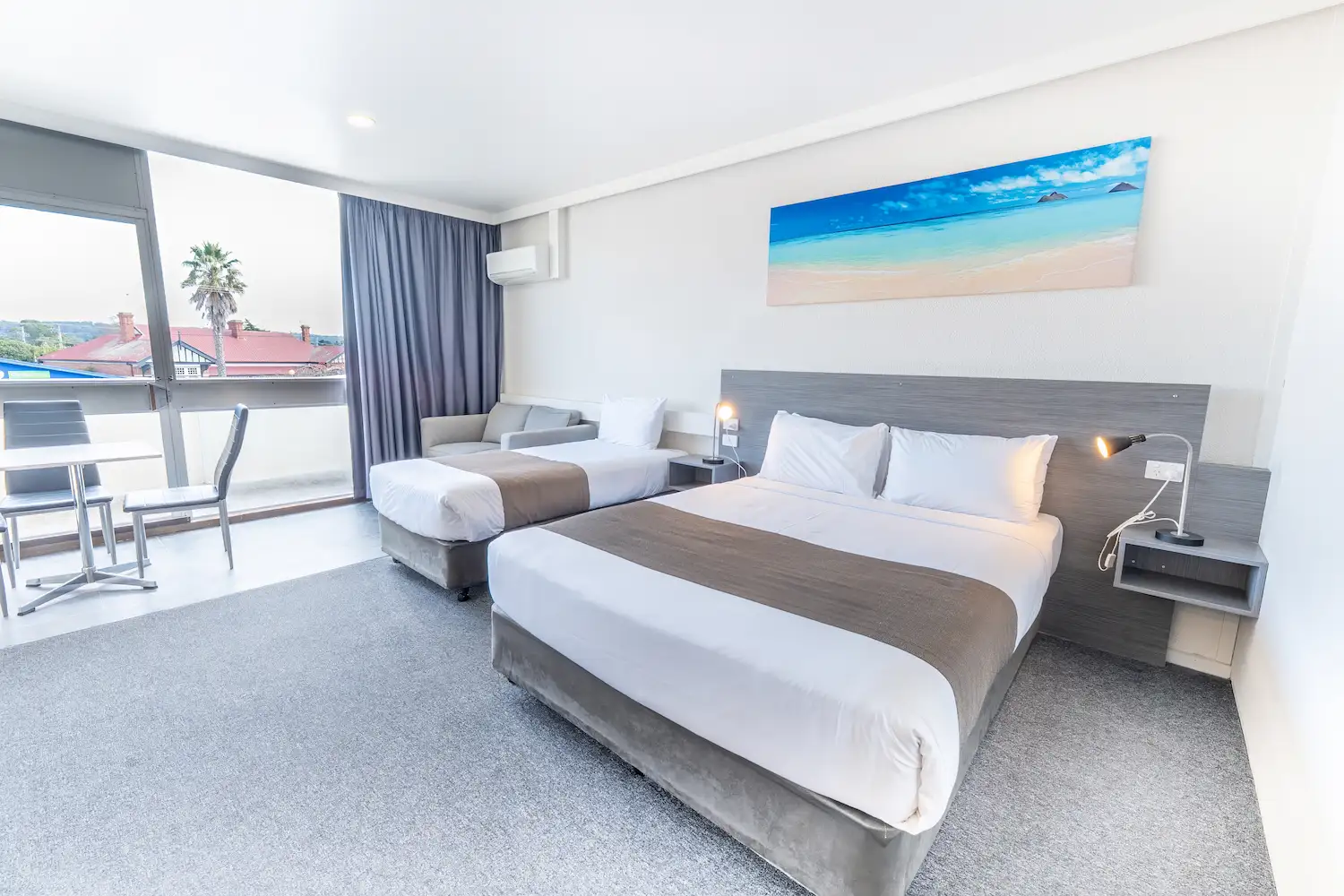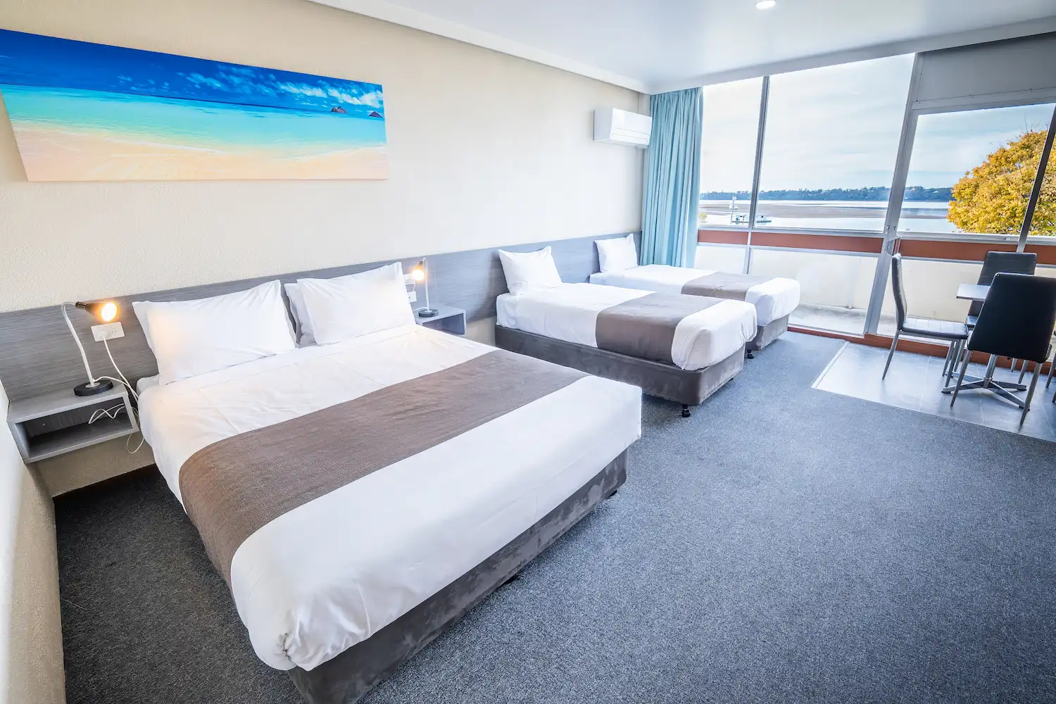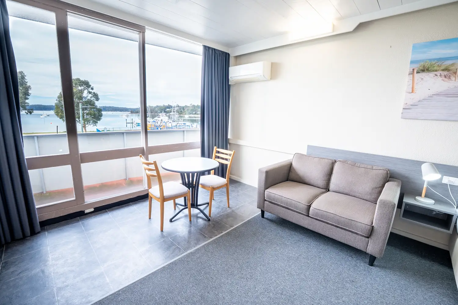 Spacious family room with bay views and a private balcony — ideal for a relaxed coastal escape.